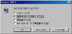 | Windows95/98/Meは、24時間連続動作には向かないOSだ。 電源をつけっぱなしにしておくと、徐々に動作が不安定になる。 なのでコンピュータを使い終わったら、いったん電源を切るのが吉。 電気代ももったいないしね(←貧乏性)。 もちろん、電源を切るときは正しい操作で。 |